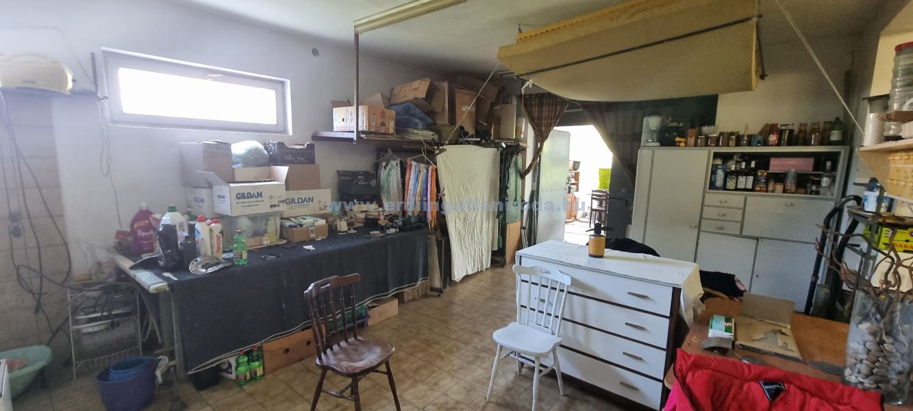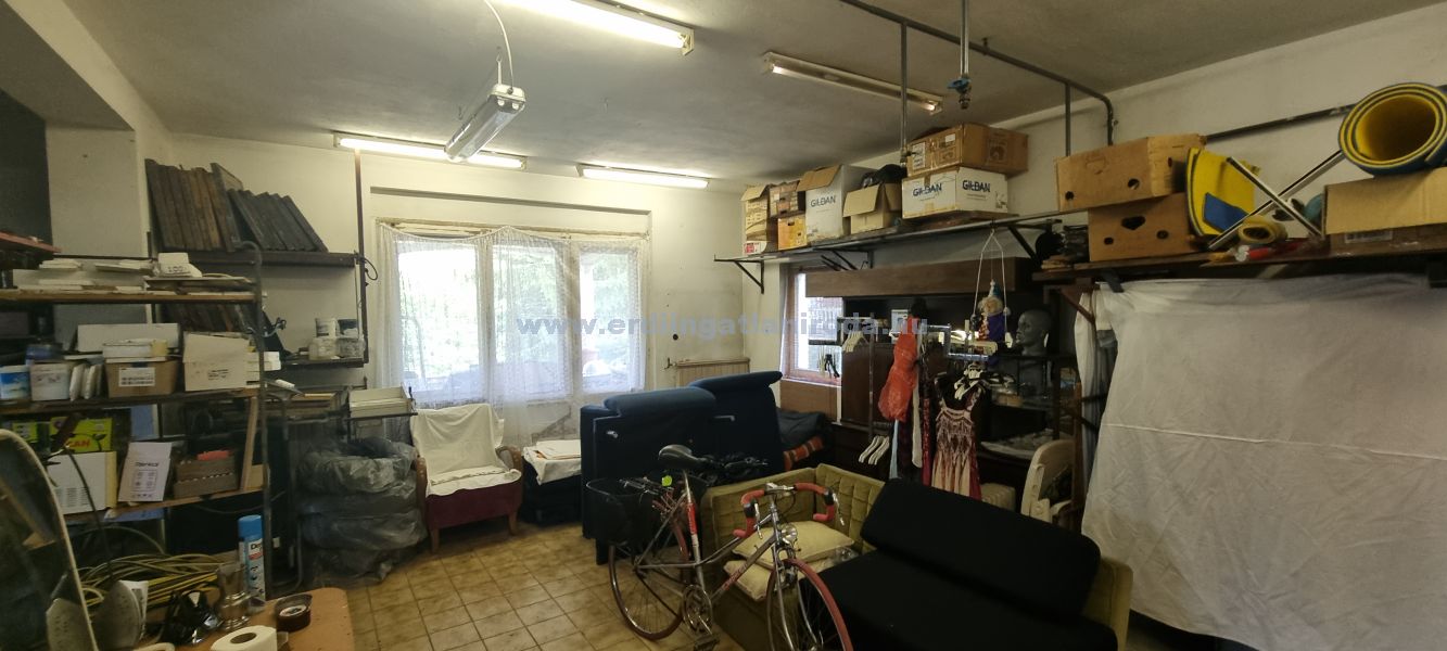 A ház földszintje 102 m2 lakóterületű + 30 m2 fedett (beton födémmel), könnyen beépíthető terasszal rendelkezik. Jelenleg műhely és tároló funkciót tölt be. Itt található a kazánház, vizesblokk egy kisebb és egy nagyobb ~ 60 m2-es helyiség. Felújítást követően remek lakótér válhat belőle vagy számos más funkció betöltésére is alkalmas lehet.