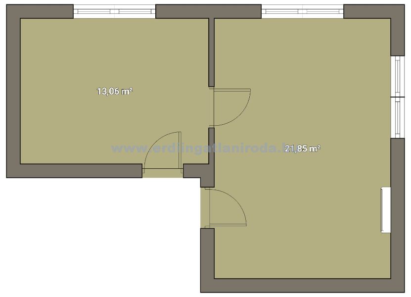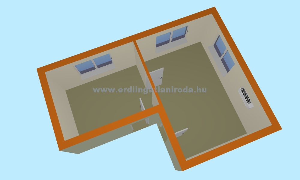 A két iroda helyiség (13 és 22 m2) között az átjárás biztosított, de a külső közlekedőről külön-külön is megközelíthetők.