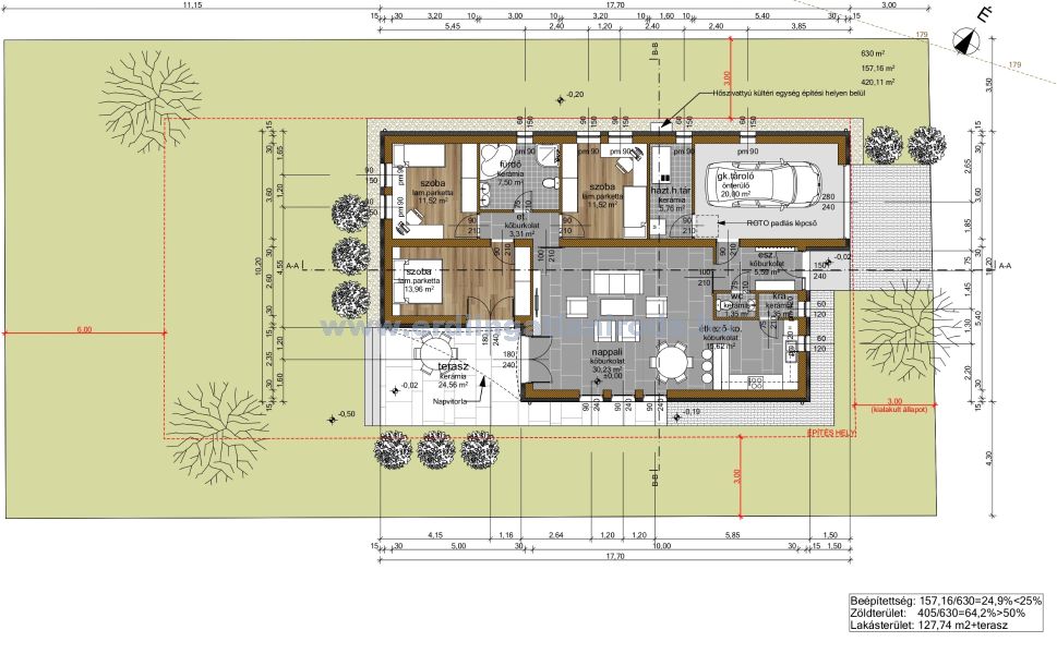 előszoba (5.59m2), wc (1.35m2), nappali (30.23m2) konyha - étkező (15.62m2), kamra (1.35m2), előtér (3.31m2), háztartási helyiség (5.76m2), fürdőszoba (7.5m2), 3 szoba (13.96m2, 11.52m2, 11.52m2), garázs (20m2), terasz (24.56m2).