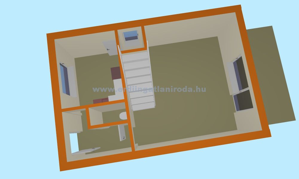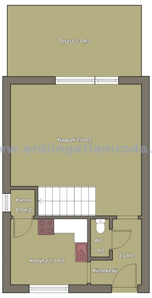 A földszinten 38 m2-en + 13 m2 terasz, az előszobából nyílóan konyha-étkező kamrával, kézmosó-WC, és terasz kapcsolatos nappali (25 m2) található.