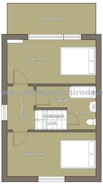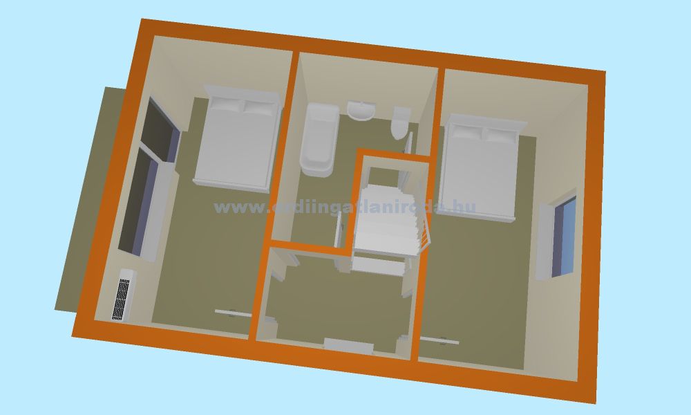 Az emelet (NEM TETŐTÉR) 37 m2 + 9 m2 erkély, közlekedő folyosóról nyílóan 2 hálószoba (mindegyik 12,5 m2), valamint fürdőszoba-WC került kialakításra. A délnyugati tájolású erkélykapcsolatos szobában klímaberendezés is felszerelésre került.
