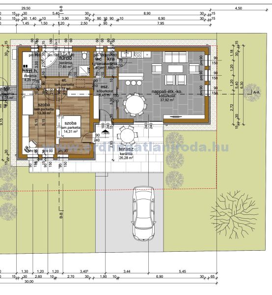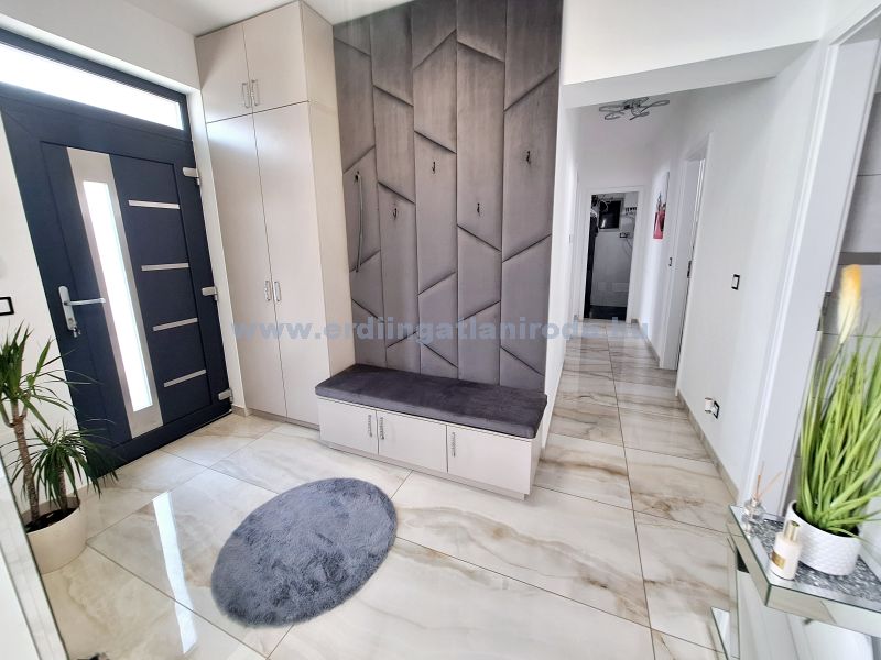 Az ingatlan elosztása : előszoba (6,45 m2), háztartási helyiség (3,25 m2), WC (1,8m2), kamra (1,8m2), nappali - étkező -gépesített konyha (37.92 m2), fürdőszoba + wc (7,8 m2), 3 szoba (13,39 m2, 14,31m2), terasz (26,28 m2).