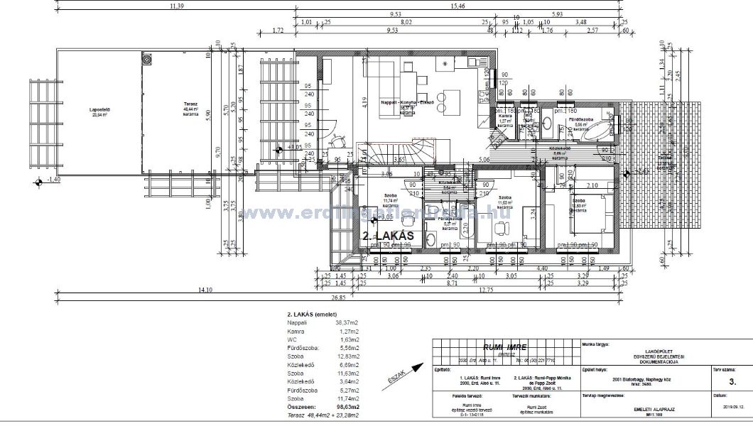 2. lakás: 105 m2 + gk.tároló 30 m2 + 57 m2 tetőterasz + 17 m2 hátsó terasz. Ára: 150- mFt. Helyiségek: Földszint: előtér, zuhanyzós fürdőszoba, garázs Emelet: konyha-étkező-nappali, a hozzá csatlakozó 57 nm-es panorámás terasszal, 3 hálószoba, 2 fürdőszoba és 1 wc helyiség, közlekedő, kamra.