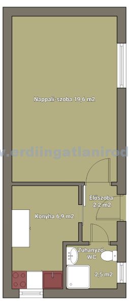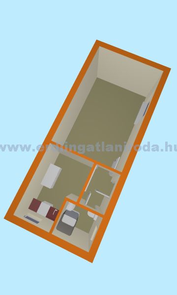 Az ingatlan téglából épült a fűtése gázkonvektorral történik. Nappali-szoba (20 m2), konyha-étkező (7 m2), fürdőszoba (zuhanyzóval, WC-vel, 3 m2) és előszoba (2 m2) helyiségekből áll.