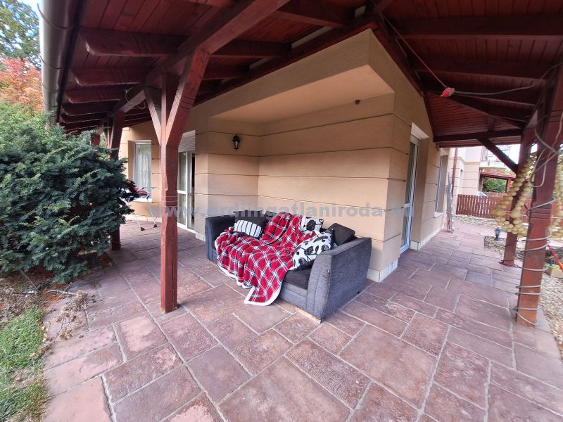 A lakáshoz saját elkerített PARKOSÍTOTT KERT tartozik, kerti tó, kő grill, dél-nyugati tájolású fedett terasz teszi az otthon tartózkodást kellemessé. A telken ÖNTÖZŐRENDSZER kiépítésre került. Az autóbeálló és a járda TÉRKÖVEZETT, a kiskapu és a nagykapu elektromos. A kertet DÍSZKIVILÁGÍTÁS teszi hangulatosabbá.
