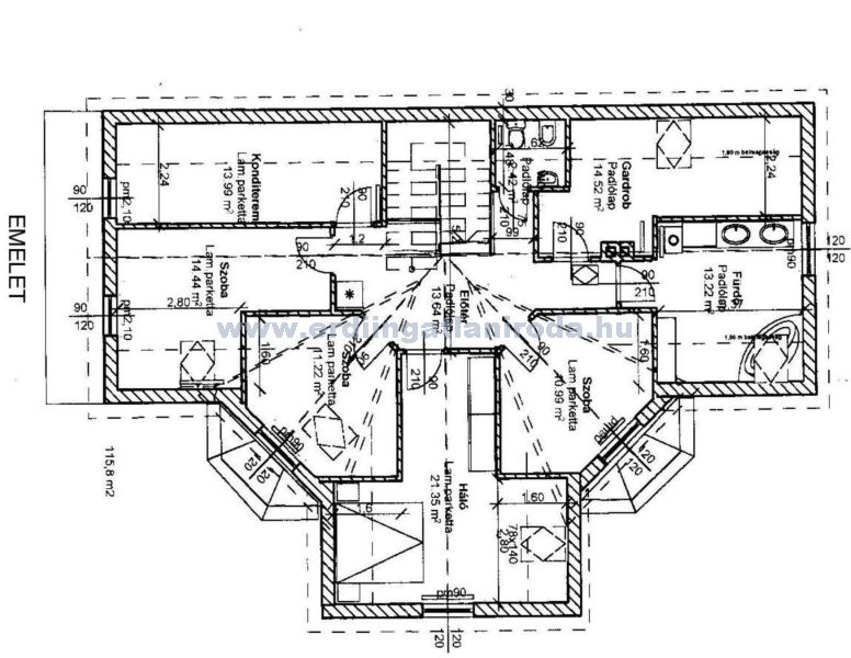 A felső szint 116 m2 (minimum 1,9 m-es belmagassággal számítva is 91 m2). Közlekedő folyosóról nyílóan 6 hálószoba, fürdőszoba, kézmosó-WC helyiségek találhatók itt.