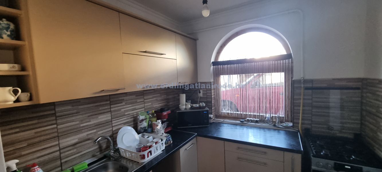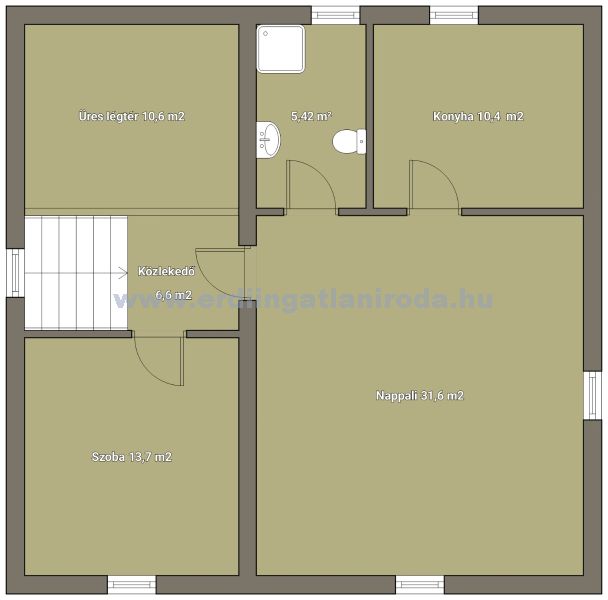 A földszint 76 m2 nappali (31 m2) + szoba (15 m2), konyha kamrával, fürdőszoba-WC, előszoba (innen indul a lépcső a felsőszintre) helyiségek találhatók.