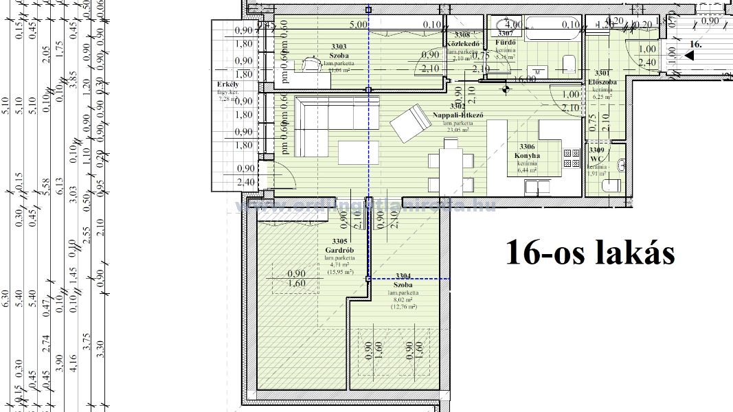 16-os lakás. 3 szoba + nappali, nettó: 68,87 m2 bruttó: 82,95 m2 (+ 7,28 m2 erkély + 5 m2 tároló). 73,238 Millió Ft (+ felszíni parkoló 1,5 Millió + Tároló 2 Millió össz.: 76,738 Millió Ft)