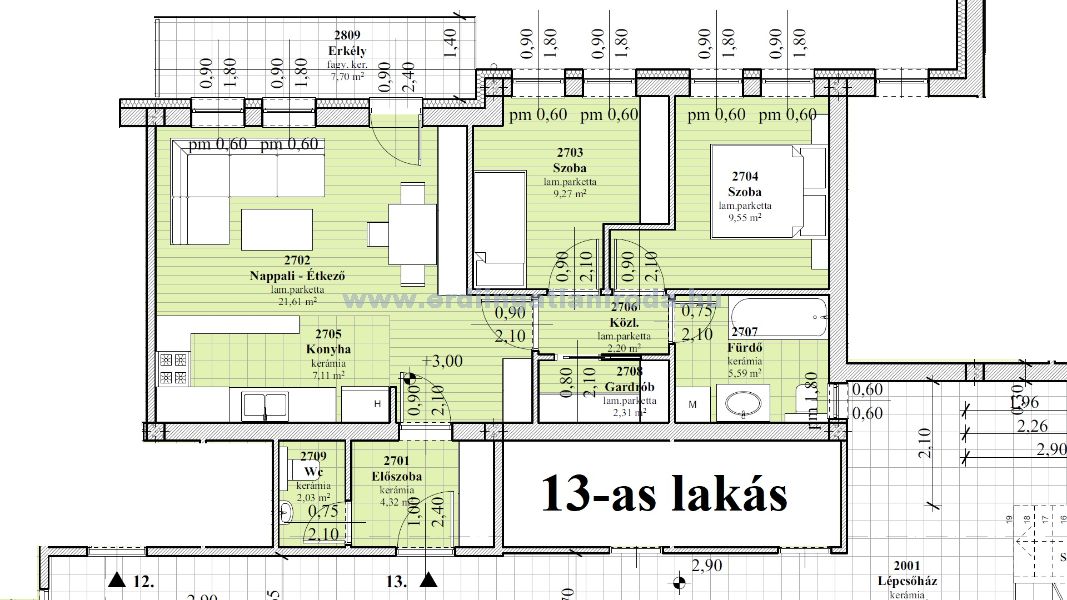 13-as lakás. 2 szoba + nappali, 63,98 m2 (+ 7,7 m2 erkély + 5 m2 tároló). 87,62 Millió Ft (+ felszíni parkoló 1,5 Millió + Tároló 2 Millió össz.: 91,12 Millió Ft)