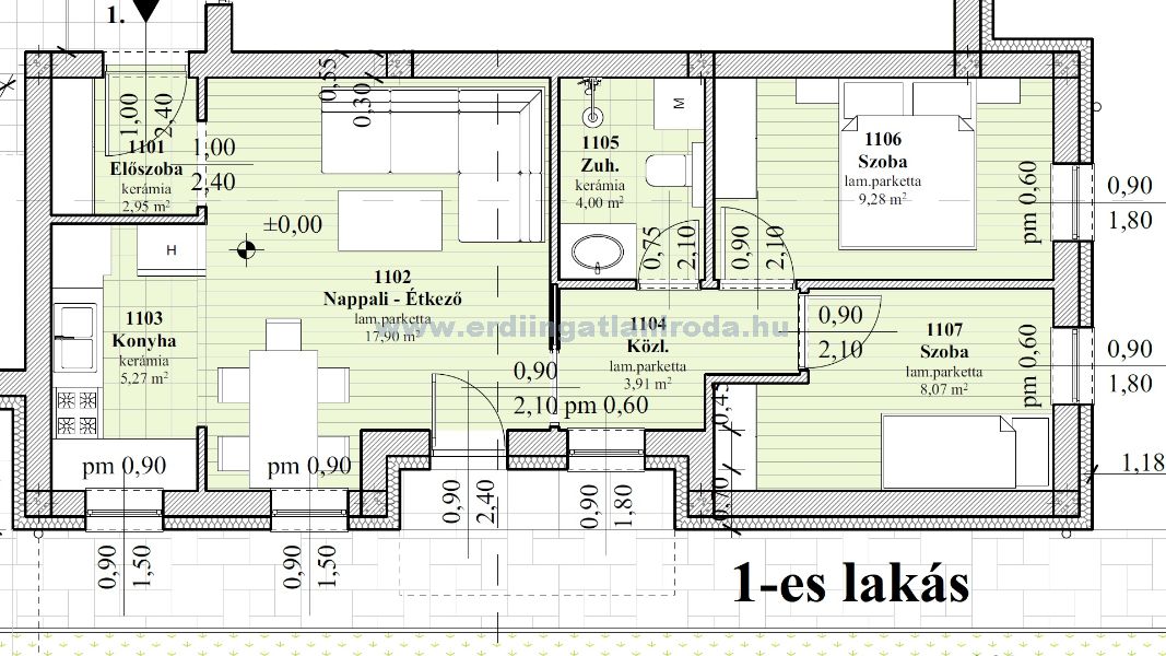 8-as lakás. 2 szoba + nappali, 60,19 m2 (+ 4,74 m2 erkély + 5 m2 tároló). 80,744 Millió Ft (+ garázs 3 Millió + Tároló 2 Millió össz.: 85,774 Millió Ft)