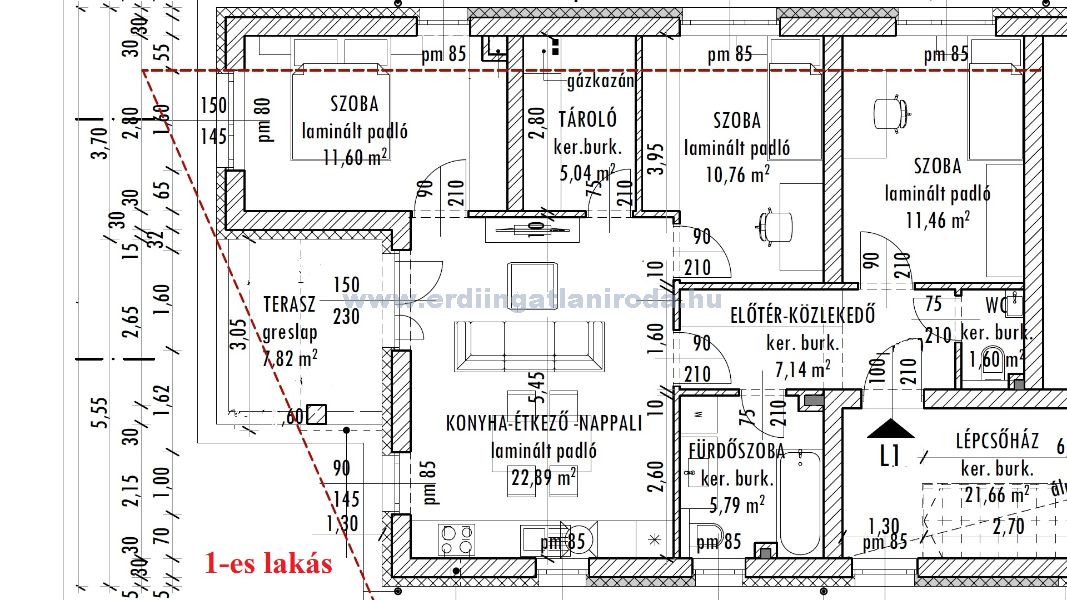 1-es lakás. 3 szoba + nappali, 76,28 m2 (+ 7,82 terasz), kertkapcsolat ~150 m2. 99,9 Millió Ft (+ kert 5 Millió + garázs 3 Millió vagy nyílt parkoló 2 Millió)