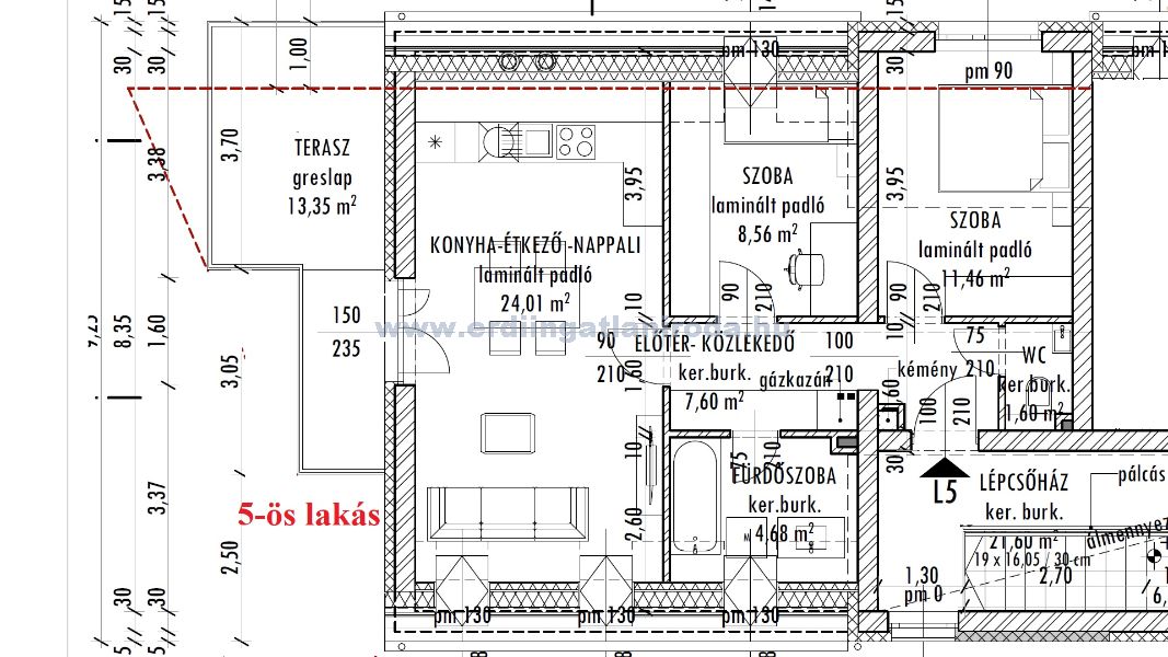 5-ös lakás. 2 szoba + nappali, nettó: 57,91 m2 (+ 13,35 m2 erkély). 78,9 Millió Ft (+ garázs 3 Millió vagy nyílt parkoló 2 Millió)