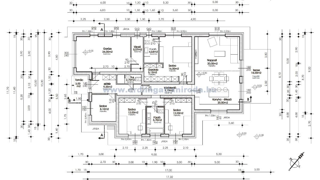 A ház Porotherm 30cm vastag tégla felmenő falazattal épül, külső homlokzaton 15cm polisztirolszigeteléssel ellátva, belső válaszfalak 10cm tégla falazattal.