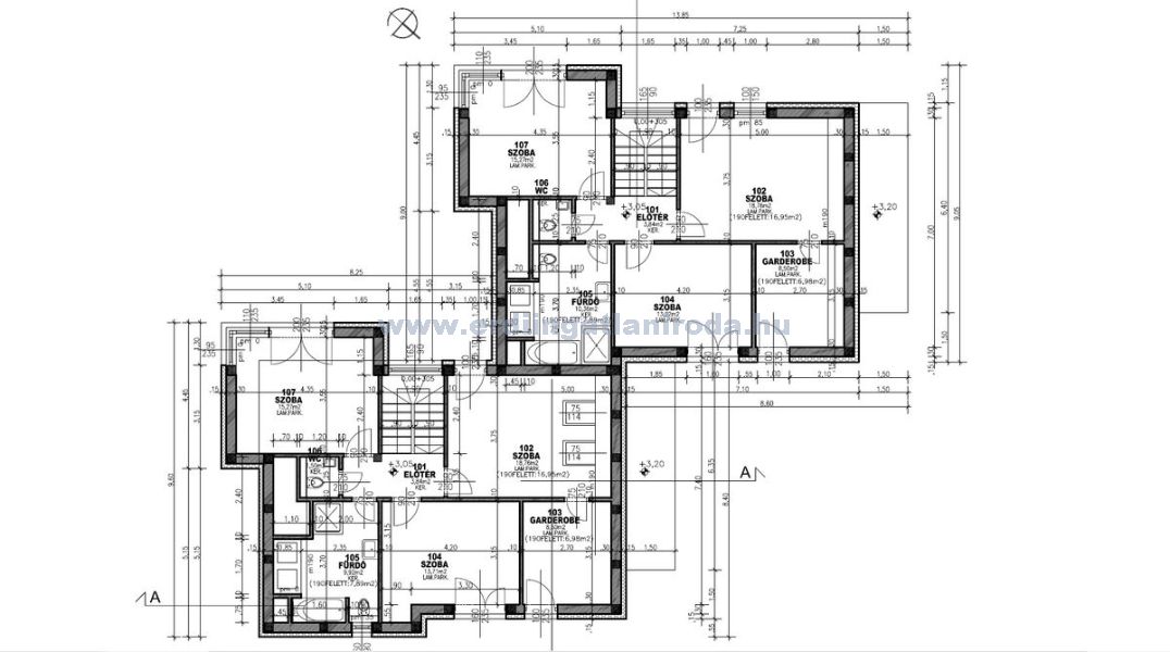 Az emeleten, 2x72 m2-en egy közlekedő folyosóról nyílóan (3.8 m2), 3 hálószoba (18.7 (17), 15.3, 13.2 m2), gardrób (8.5 m2), egy káddal, zuhanyzóval, dupla mosdóval, WC-vel felszerelt fürdőszoba (10.4 m2), kézmosó-WC (1.5 m2) található.