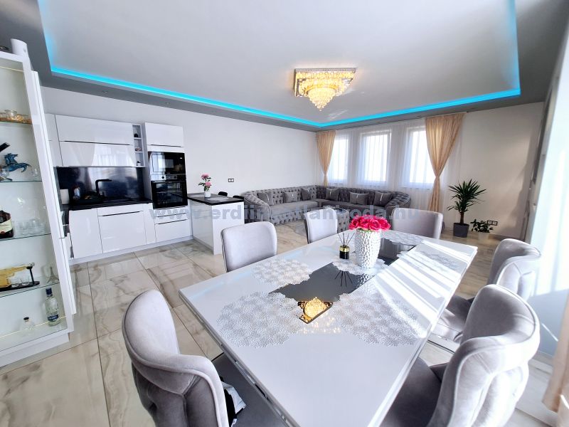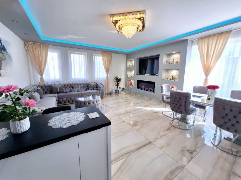 Az ingatlan elosztása : előszoba (6,45 m2), háztartási helyiség (3,25 m2), WC (1,8m2), kamra (1,8m2), nappali - étkező -gépesített konyha (37.92 m2), fürdőszoba + wc (7,8 m2), 3 szoba (13,39 m2, 14,31m2), terasz (26,28 m2).