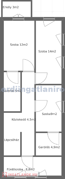 Emelet: közlekedő (4,5m2), fürdőszoba (8,8m2), szoba (9m2) gardróbbal (4,9m2), szoba (14m2), szoba (12m2) gardróbbal (5m2) erkéllyel (3m2)
