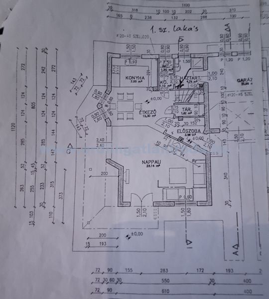 Földszint: előszoba (3,96m2), kamra (1,82), nappali (28,14m2) teraszkapcsolattal, étkező (15,3m2), minőségi gépekkel beépített konyha (7m2), háztartásihelyiség (4,84m2), WC (1,2m2), automatizált garázs (21,89m2)