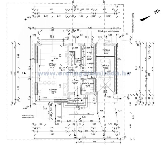 Földszinten: konyha (11,52m2), nappali (30,24m2), előszoba (8,05m2), fürdőszoba (4,2m2), mosókonyha (8,48m2), közlekedő (2,76m2), garázs (17,1m2), tároló (5,1m2), kamra (0,76m2)