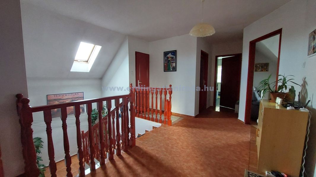 A felső szint 116 m2 (minimum 1,9 m-es belmagassággal számítva is 91 m2). Közlekedő folyosóról nyílóan 6 hálószoba, fürdőszoba, kézmosó-WC helyiségek találhatók itt.
