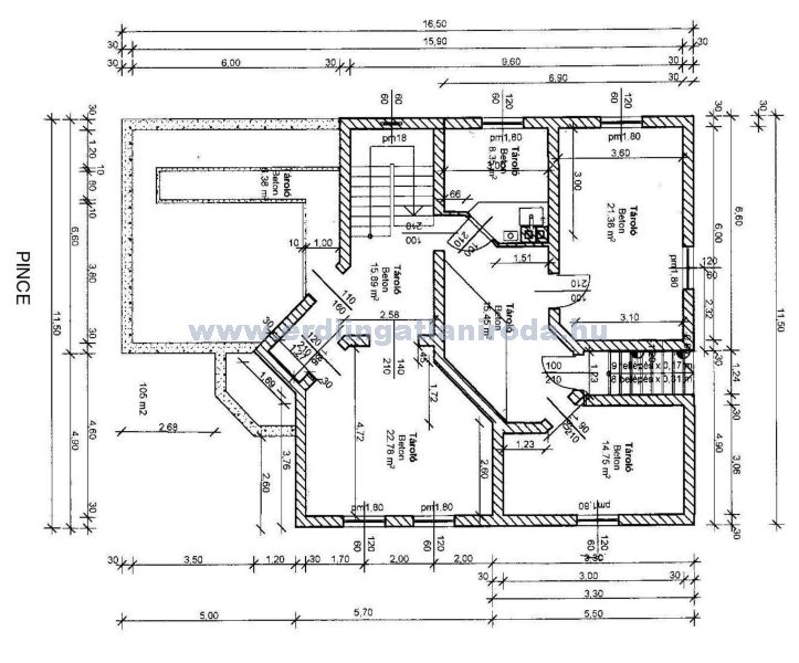A pince a hátsó kert felől és épületen belül is megközelíthető 105 m2-es. Tüzelőanyag tároló és kazánház (8 m2), a garázs szerelőaknájához vezető bejárat, és 4 nagy tároló (23; 22; 15; 15 m2) került kialakításra.