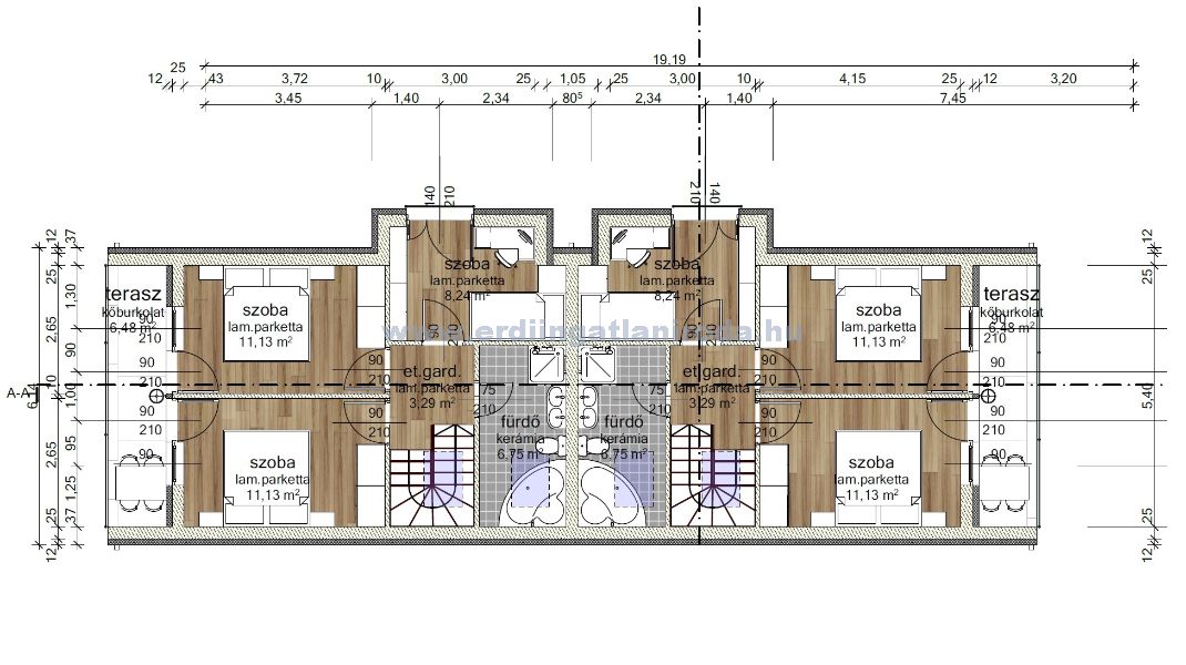 Az emeleten 41 m2-en (+6,5 m2 fedett erkély) közlekedőről nyílóan 3 hálószoba (11,1; 11,1; 8,2 m2) valamint fürdőszoba-WC került kialakításra. A két nagyobbik hálószóbából egyaránt kijárat nyílik az erkélyre.