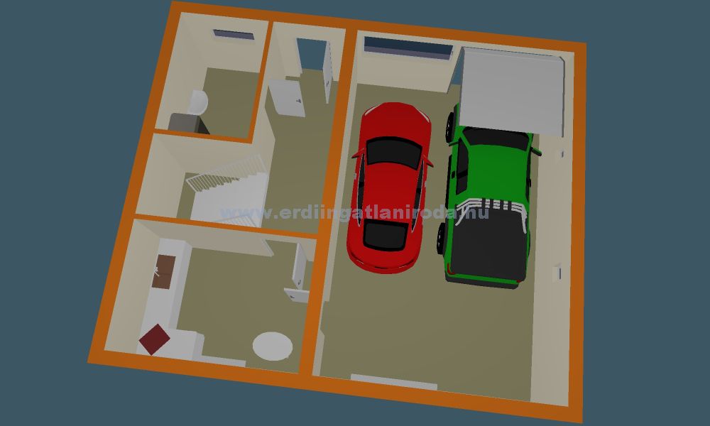 A földszint 80 m2. Előszoba, garázs (45 m2), konyha-étkező és kézmosó-WC helyiségekből áll.
