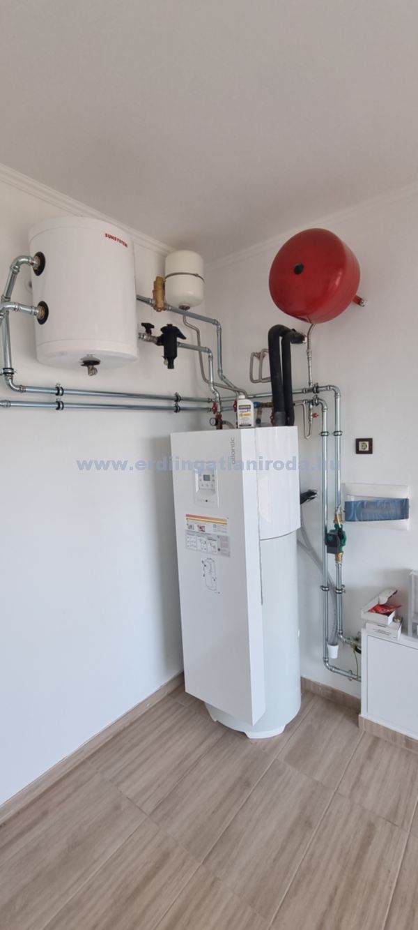 A ház fűtése és használati melegvíz ellátása 10 kW-os, hőszivattyú készülékről történik padló hőleadással.