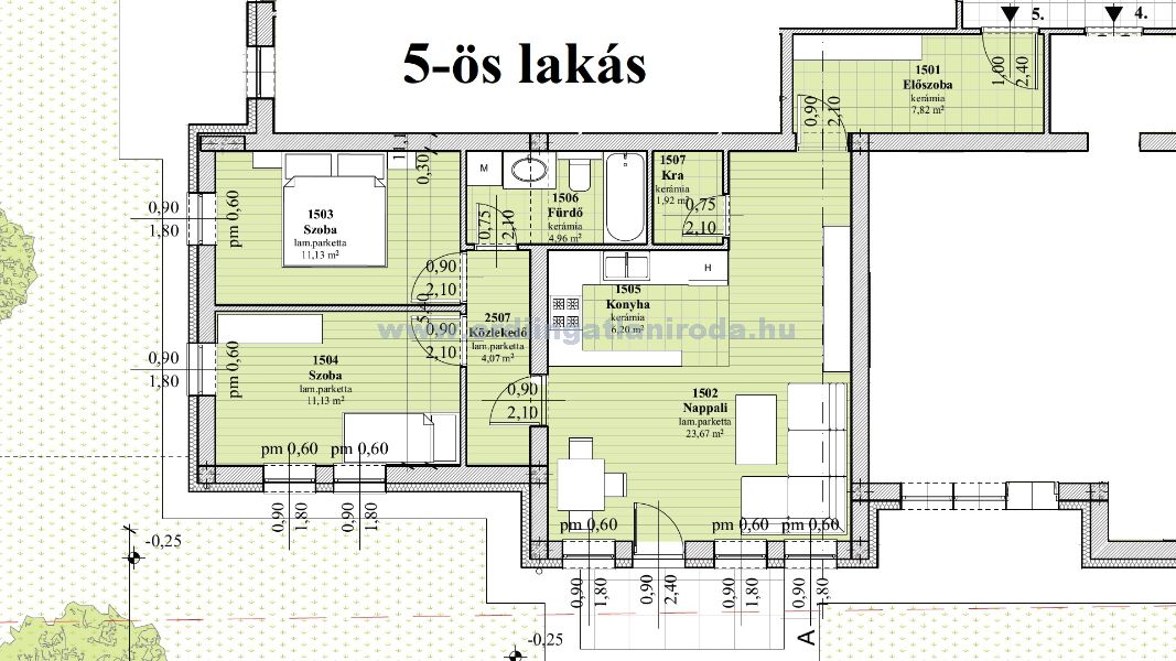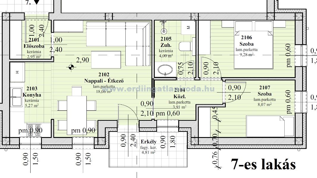 7-es lakás. 2 szoba + nappali, 51,54 m2 (+ 4,81 m2 erkély + 5 m2 tároló). 69,886 Millió Ft (+ garázs 3 Millió + Tároló 2 Millió össz.: 74,886 Millió Ft)