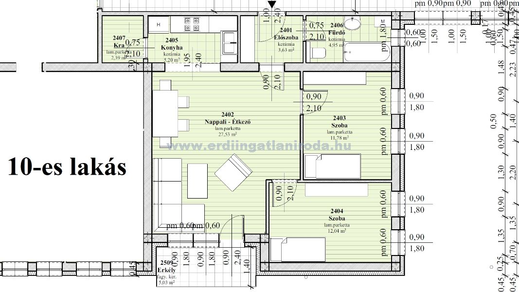 10-es lakás. 2 szoba + nappali, 67,52 m2 (+ 5,03 m2 erkély + 5 m2 tároló). 90,518 Millió Ft (+ felszíni parkoló 1,5 Millió + Tároló 2 Millió össz.: 94,018 Millió Ft)