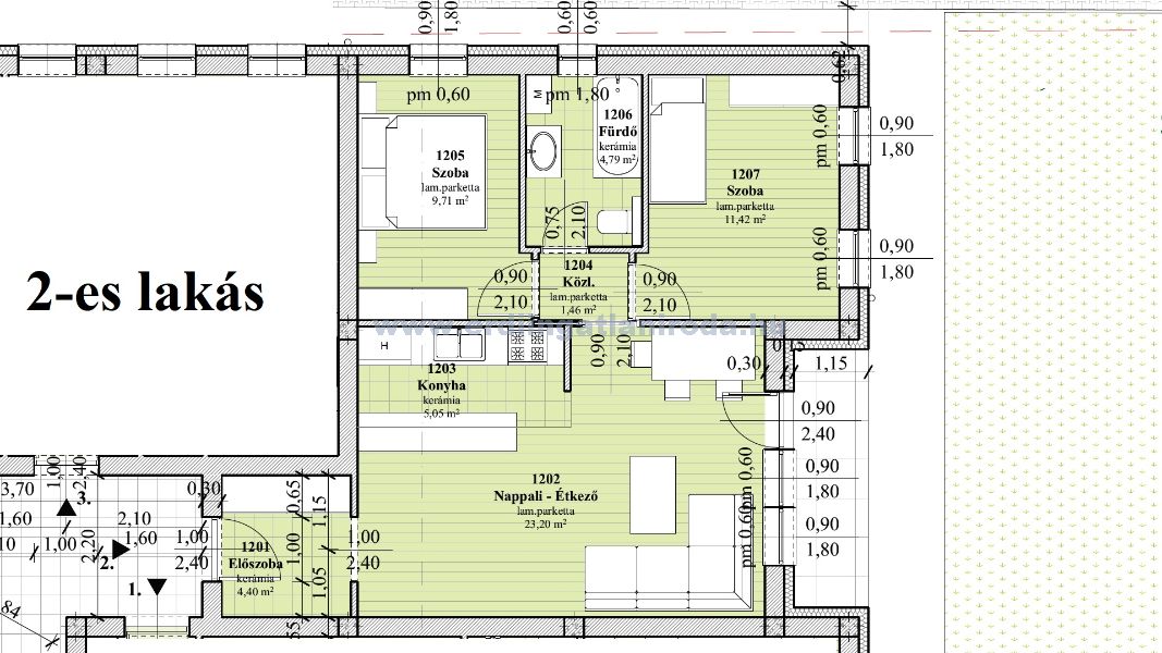 8-as lakás. 2 szoba + nappali, 60,19 m2 (+ 4,74 m2 erkély + 5 m2 tároló). 80,744 Millió Ft (+ garázs 3 Millió + Tároló 2 Millió össz.: 85,774 Millió Ft)