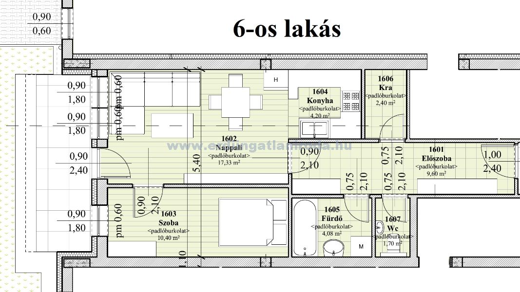 6-os lakás. 2 szoba + nappali, 49,71 m2 (+ 4,6 m2 terasz + 5 m2 tároló), kertkapcsolat. 64,5 Millió Ft (+ garázs 3 Millió + Tároló 2 Millió össz.: 69,5 Millió Ft)