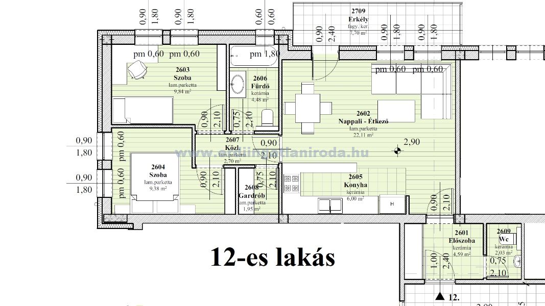 12-es lakás. 2 szoba + nappali, 63,07 m2 (+ 7,7 m2 erkély + 5 m2 tároló). 86,520 Millió Ft (+ felszíni parkoló 1,5 Millió + Tároló 2 Millió össz.: 90,02 Millió Ft)