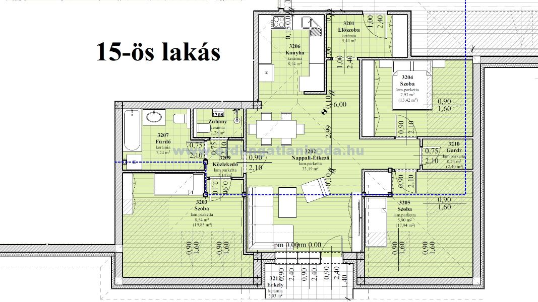 15-ös lakás. 3 szoba + nappali, dupla fürdőszobás, nettó: 81,04 m2 bruttó: 112 m2 (+ 5,03 m2 erkély + 5 m2 tároló). 84,018 Millió Ft (+ felszíni parkoló 1,5 Millió + Tároló 2 Millió össz.: 87,518 Millió Ft)